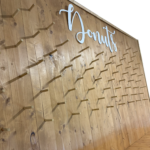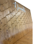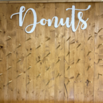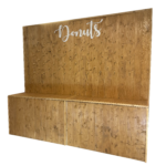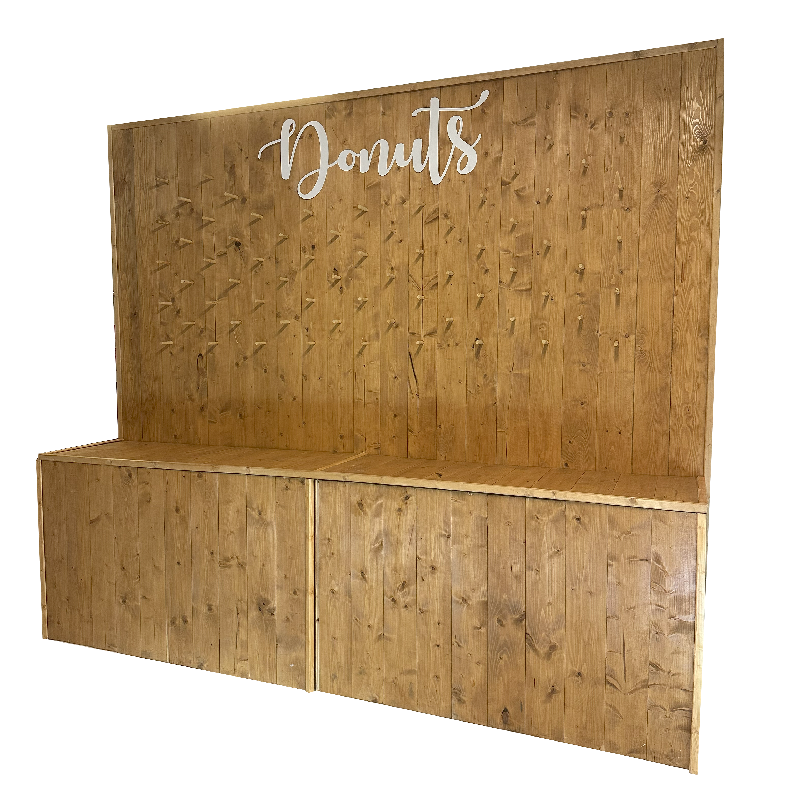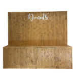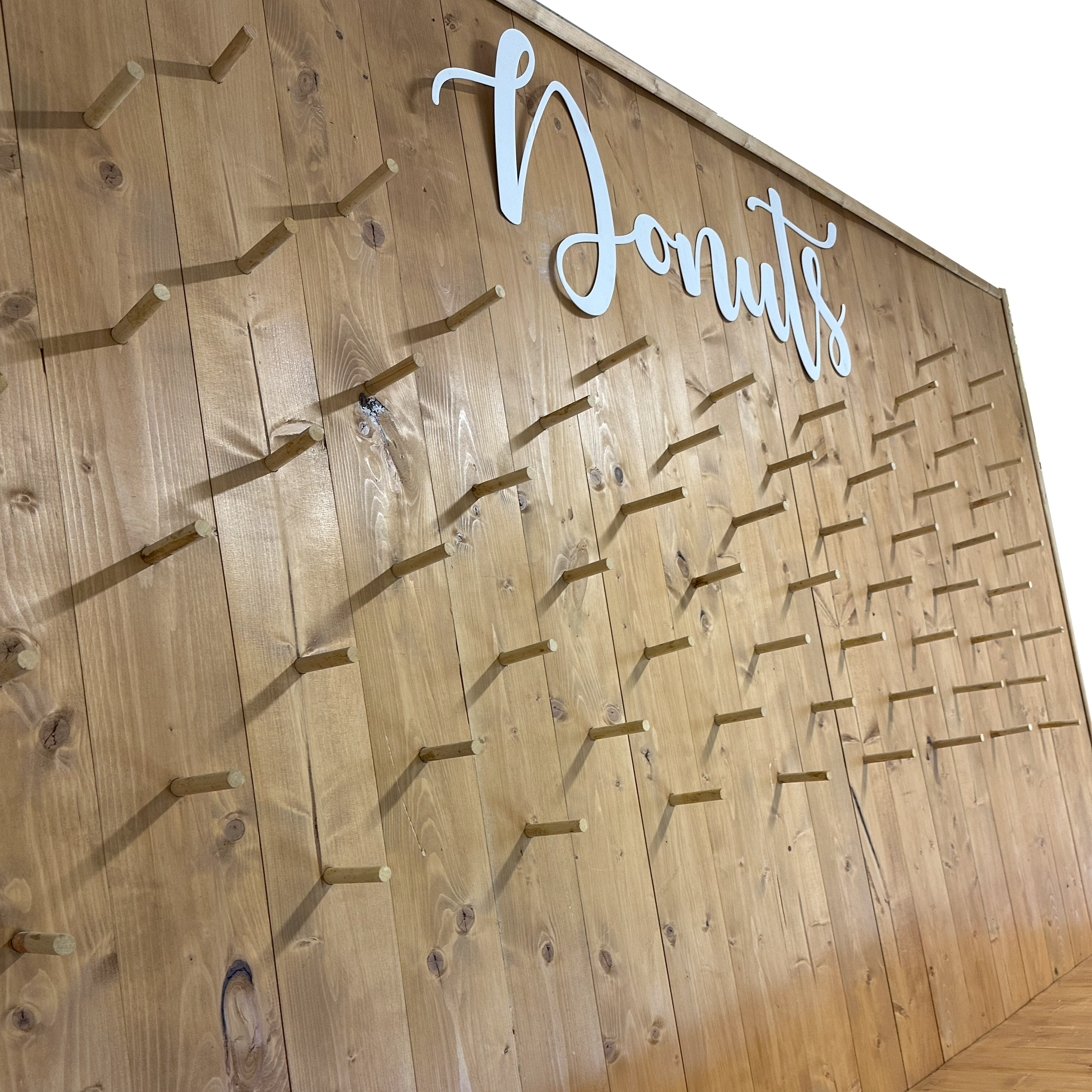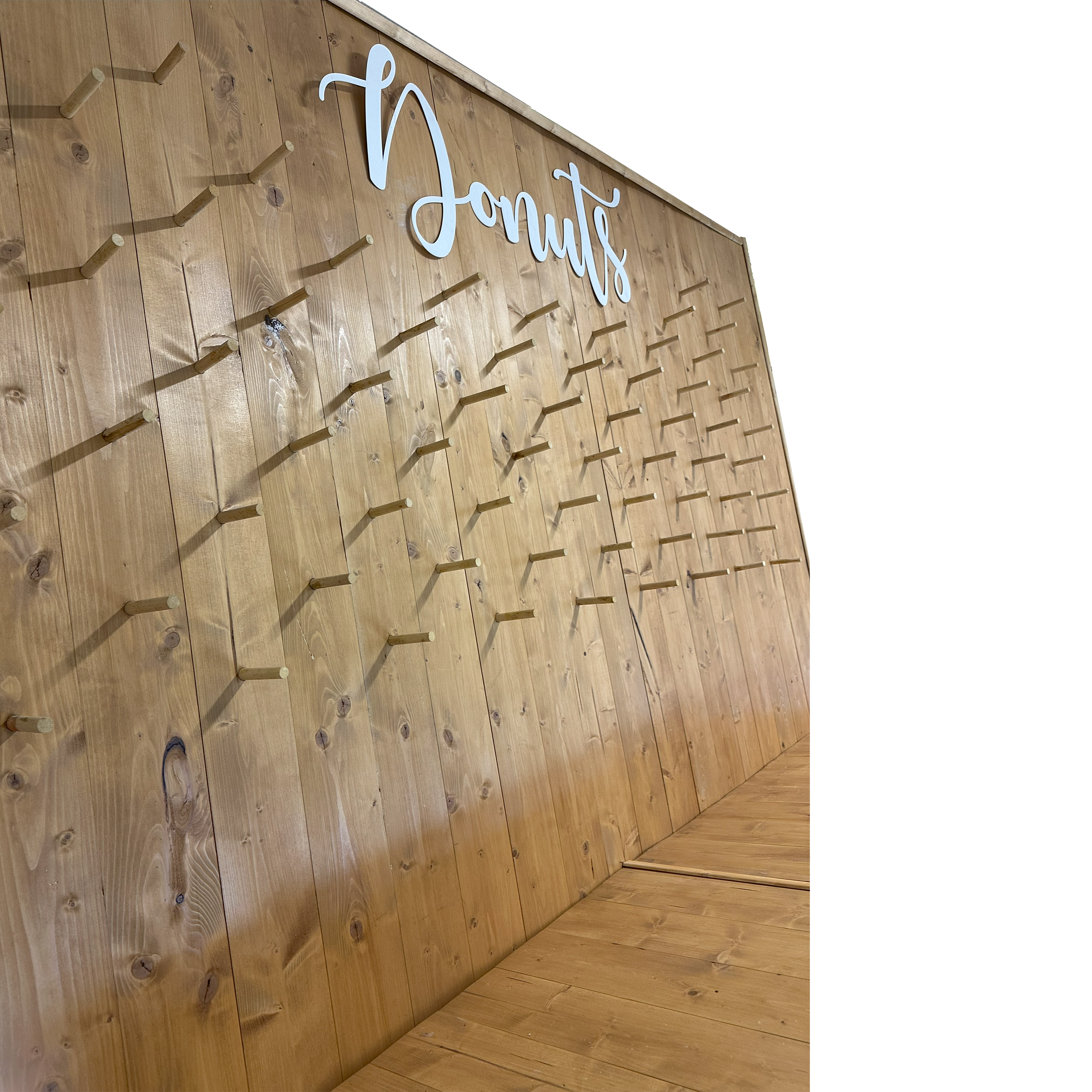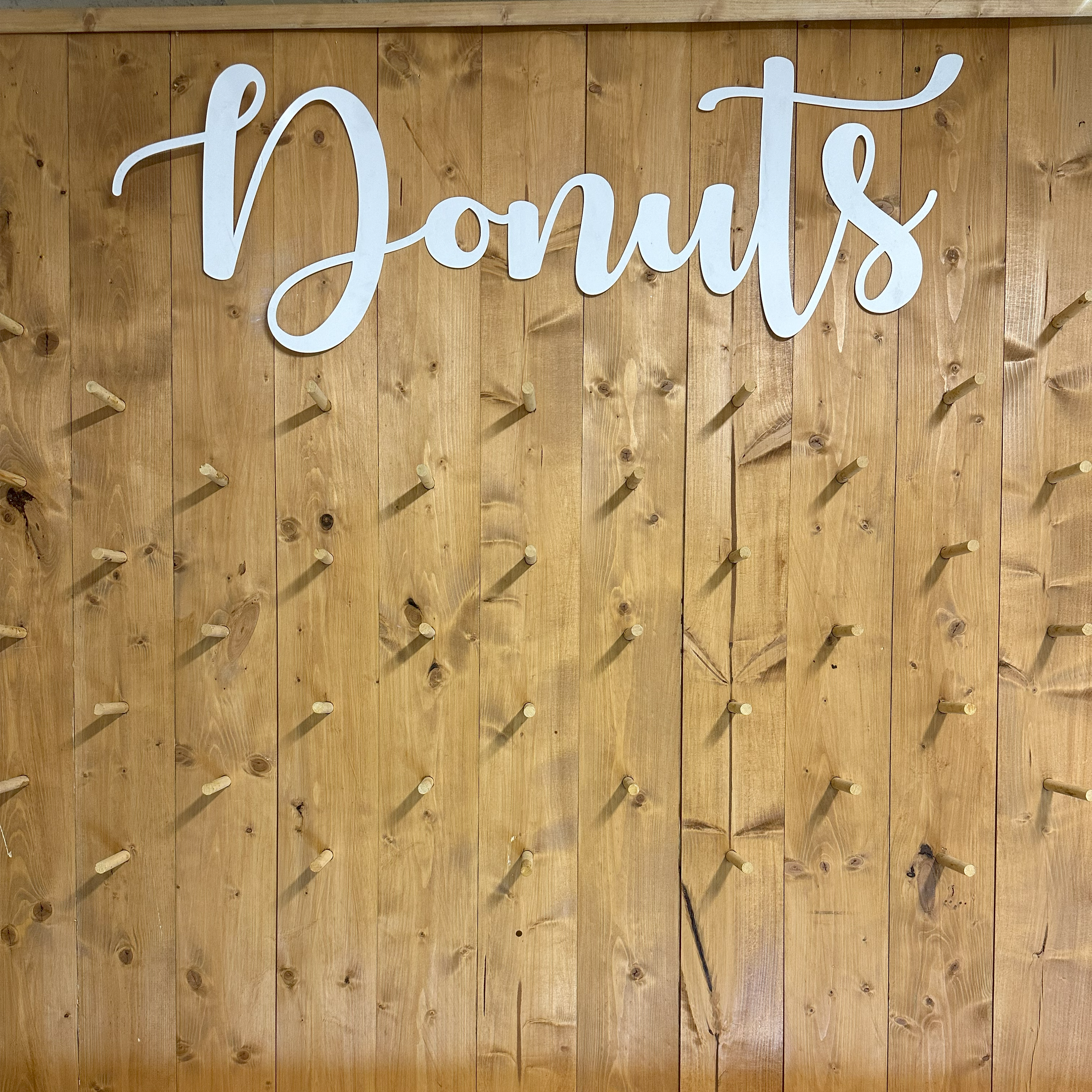 Questo arredo per eventi è una parete in legno progettata per contenere e esporre una varietà di deliziosi donut.